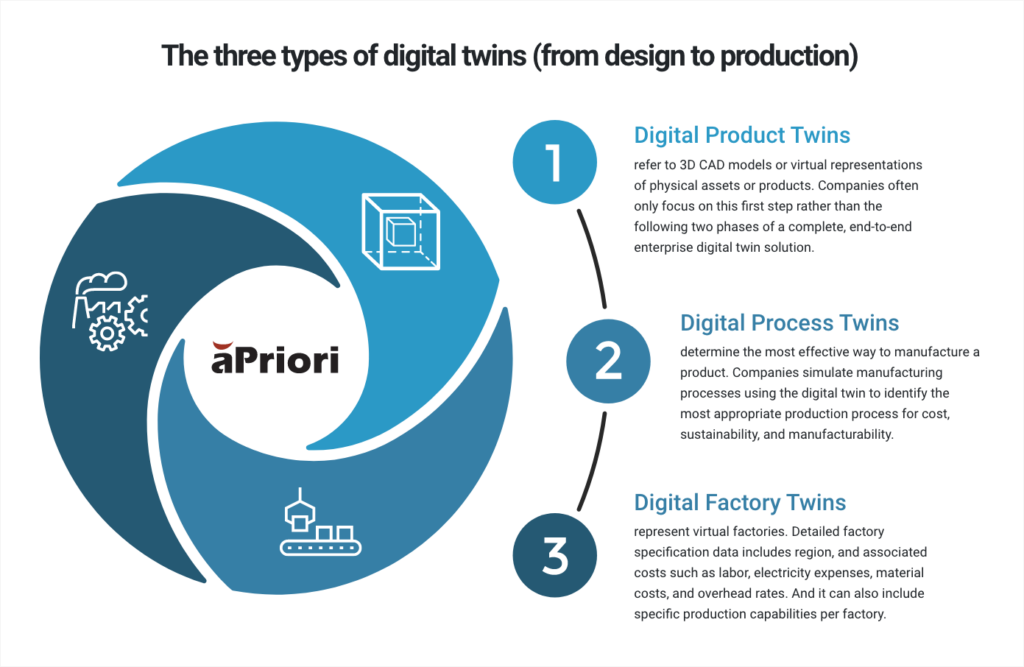 Designoptimierung: Abgesehen von Ästhetik und Leistung können Designfehler und funktionale Neugestaltungen zu ECOs, einer langsamen Markteinführung und Kostensteigerungen führen. KI-gestützte Design- und Beschaffungsinformationen wie aPriori können potenzielle Designprobleme identifizieren und Empfehlungen zur Reduzierung der Prozess- und Produktionskomplexität, der Vorlaufzeit und der Herstellungskosten geben. aP Design liefert Aktualisierungen der Szenariokriterien über mehrere Design-Iterationen hinweg (z. B. Vollkosten, CO2e, DFM) und reduziert so Redesigns und späte ECOs. Materialien, Produktionsprozesse und Kostenziele können in dieser äußerst kritischen Phase optimiert werden. Erkenntnisse liefern Vorschläge zur Kostensenkung, ohne die Produktqualität zu beeinträchtigen. Hersteller können die digitalen Produkt-, Prozess- und Fabrikzwillinge nutzen, die zusammen den digitalen Faden im Designprozess und während der gesamten Produktentwicklung bilden.