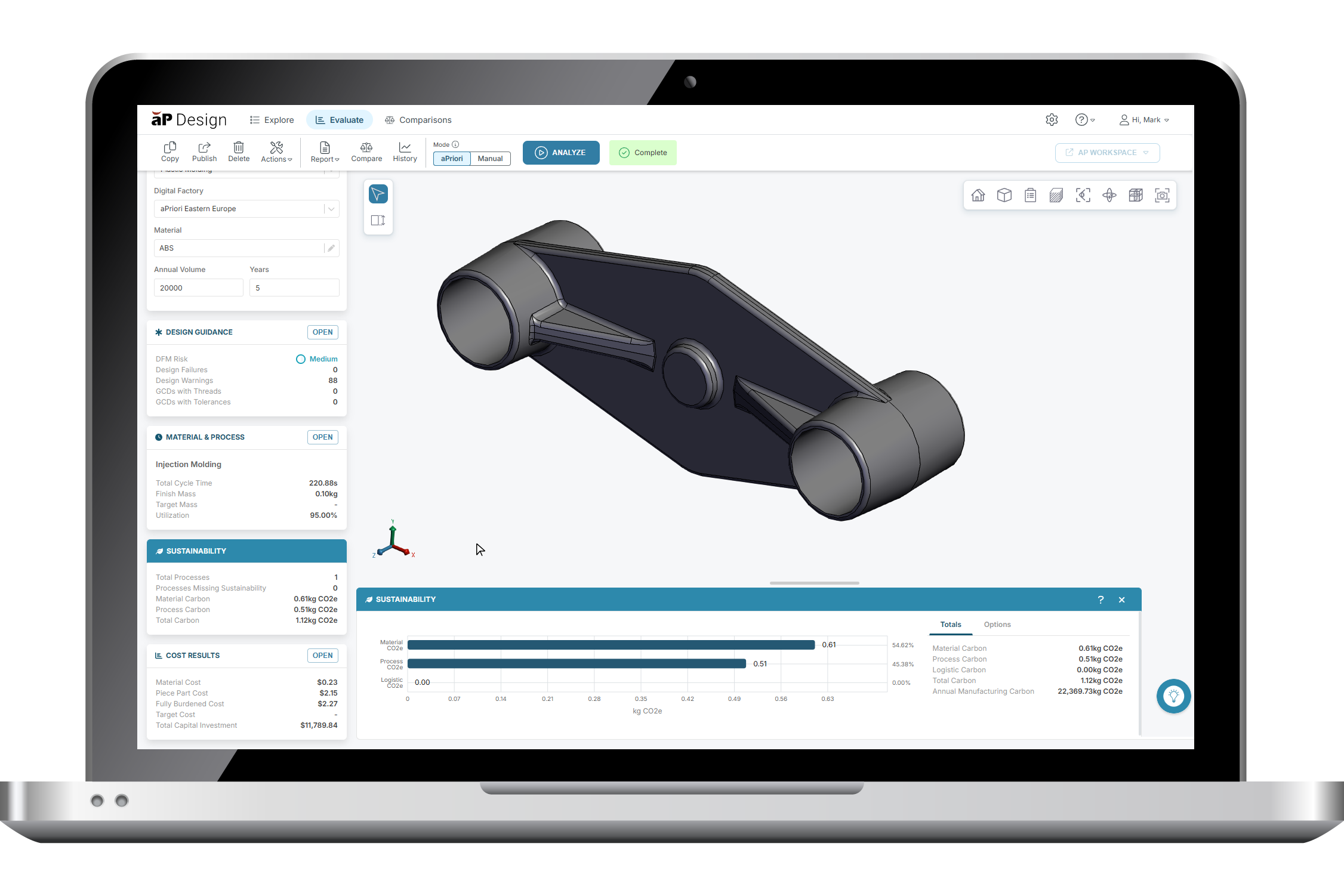 Die aPriori Manufacturing Insight Platform kann schnell und einfach die CO2e-Emissionen berechnen, die mit der Herstellung neuer oder aktualisierter Produktdesigns verbunden sind.