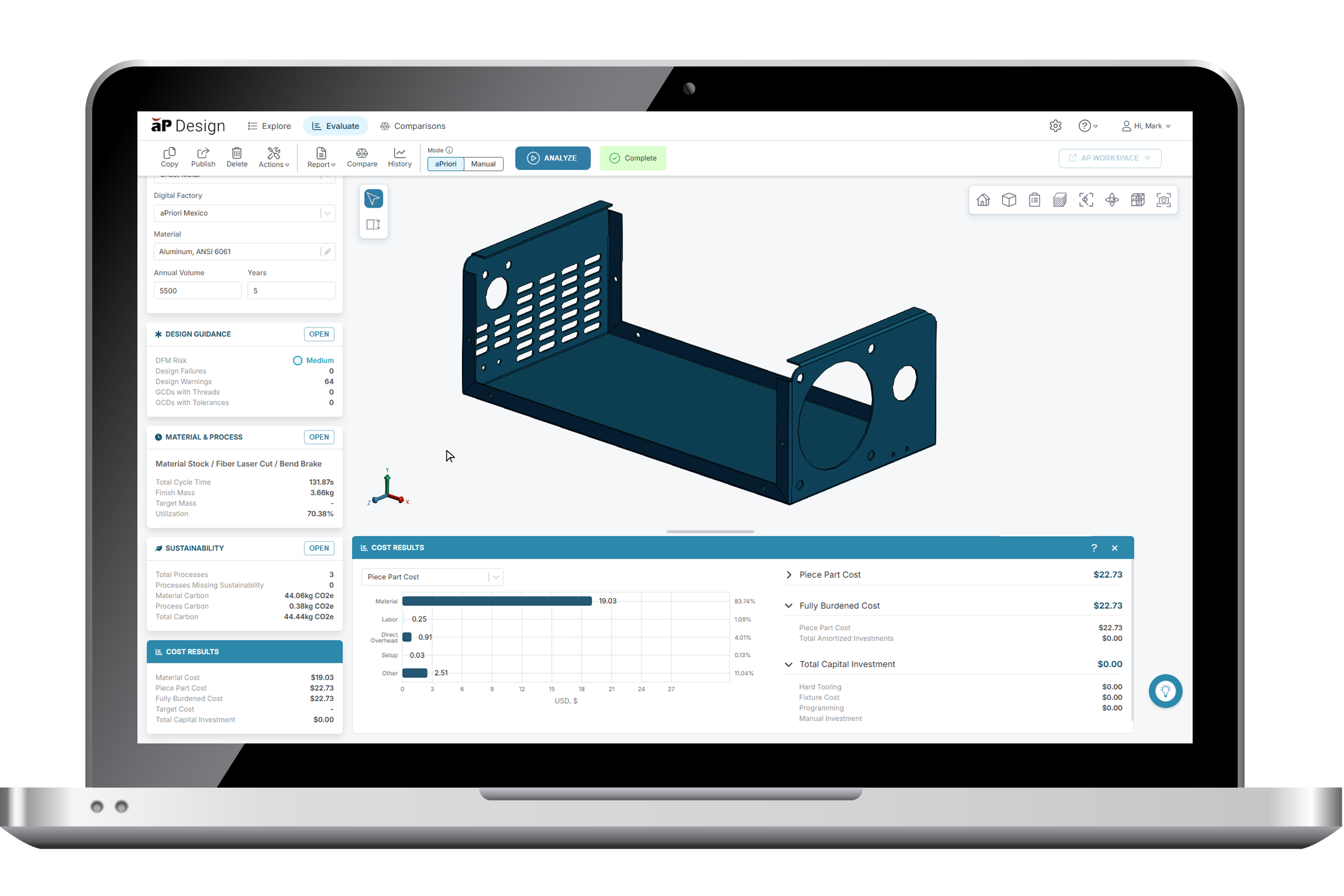 Öffnen Sie Ihr digitales Zwillingsmodell in aPriori, geben Sie einige grundlegende Eingaben ein, wie z.B. den Fertigungsprozess, das Volumen und den Herstellungsort, und führen Sie dann eine Fertigungssimulation innerhalb einer aPriori digitalen Fabrik durch. aPriori erstellt dann schnell eine detaillierte Analyse der Fertigungsabläufe und -kosten. Produktteams können auch Zielkosten festlegen und erhalten aPriori-Warnungen, wenn Designs Kostenschwellen überschreiten.